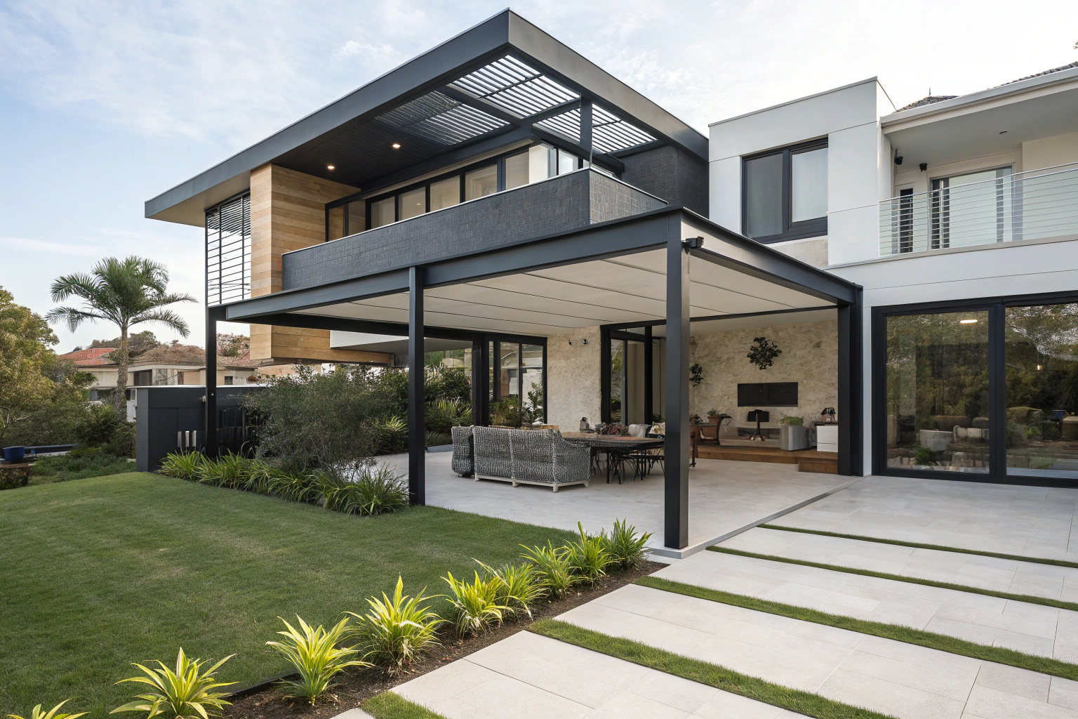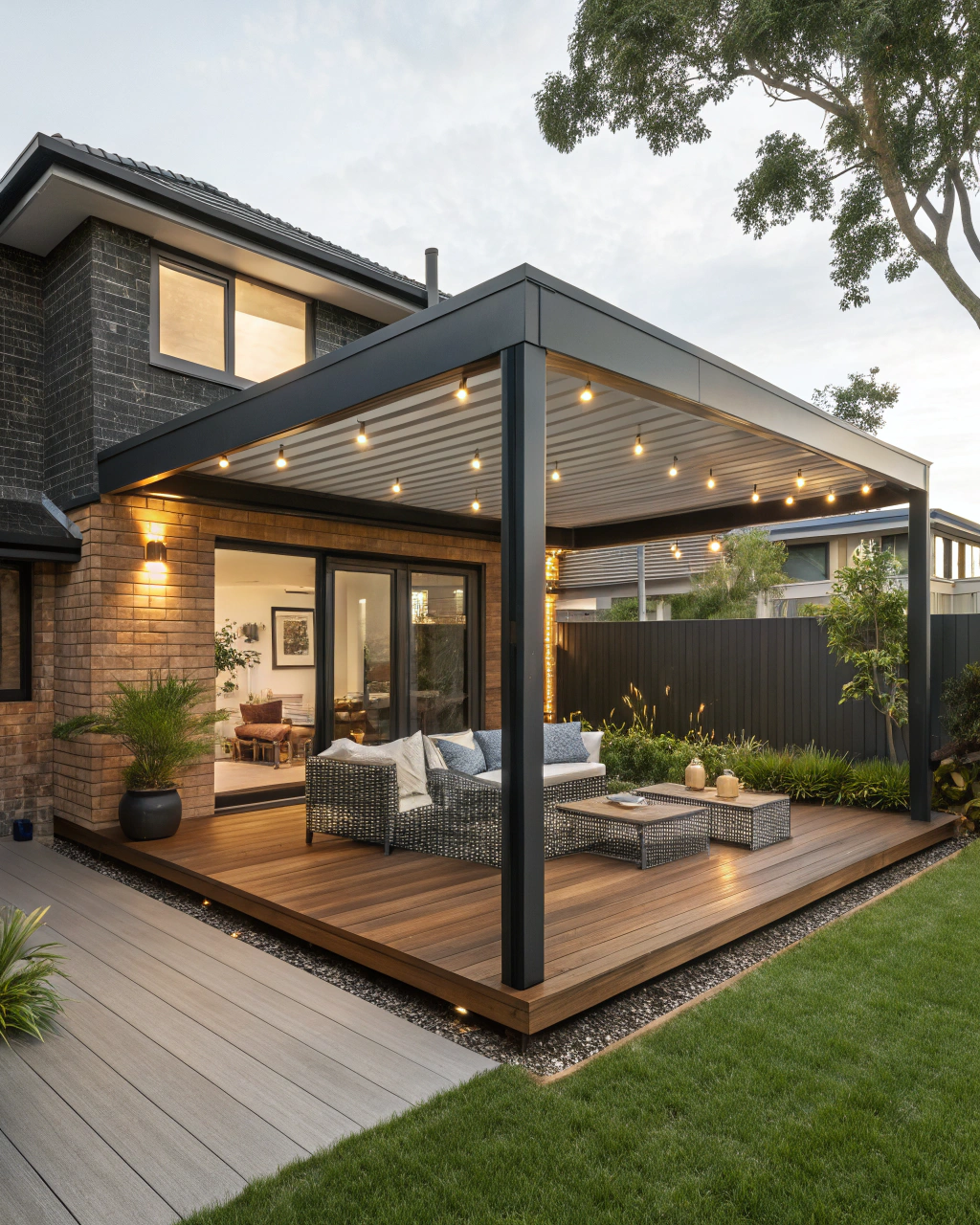 Decking flows naturally from a metal frame gazebo, with post positions planned from the start to avoid awkward junctions between structure and surface. Paving — whether sandstone, concrete, or porcelain — reads well beneath a metal frame, reinforcing the contemporary aesthetic rather than working against it. Privacy screening in powder-coated aluminium or Colorbond can be specified to match the frame finish exactly, creating a unified structural palette across the whole outdoor area.
