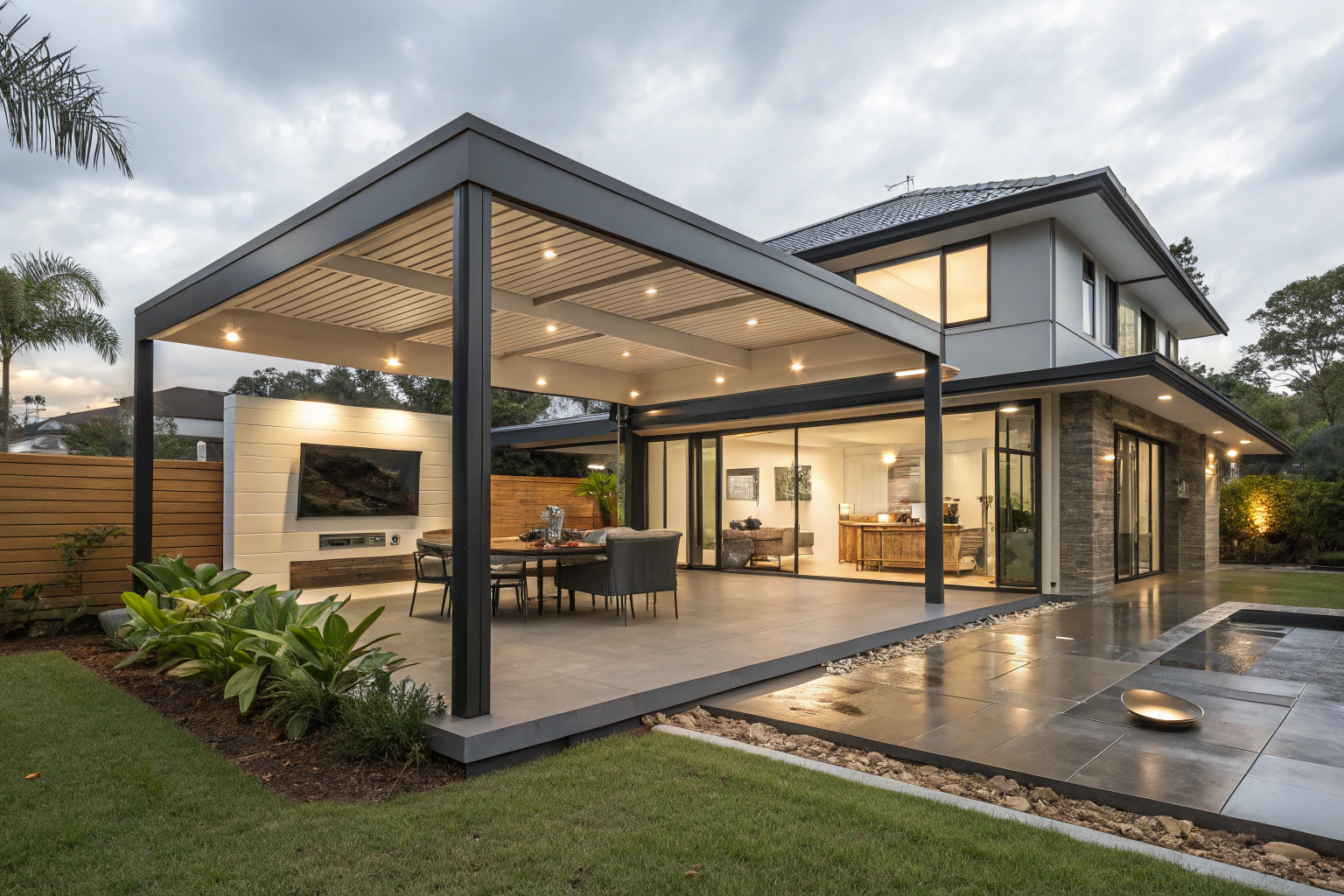 Colorbond roofing is the most common choice and integrates naturally with steel and aluminium frames. Insulated panel roofing suits entertaining spaces where thermal comfort matters. Polycarbonate panels work well where natural light through the roof is the priority.